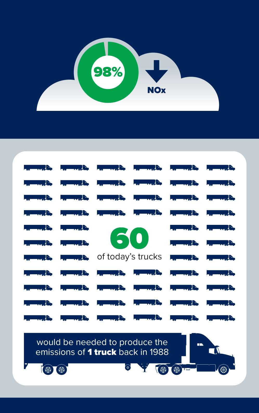 Truck engines manufactured today emit 98% less nitrogen oxide (NOx) and particulate matter (PM) than those built thirty-five years ago. In fact, 60 of today's trucks emit what just one truck emitted in 1988.
